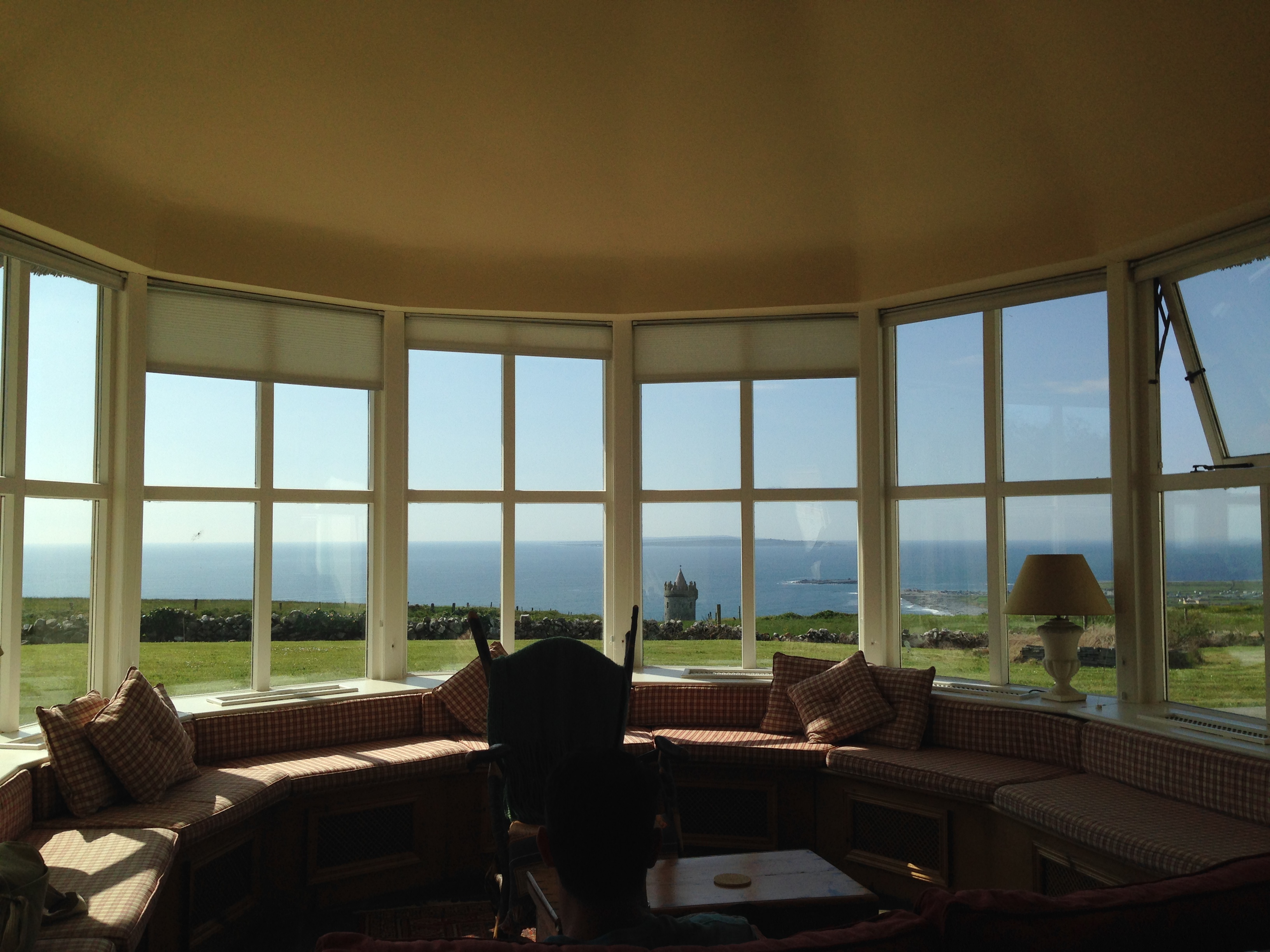 Our thatched roof cottage in Doolin, IE, with a castle tower and the Atlantic Ocean in the front yard.