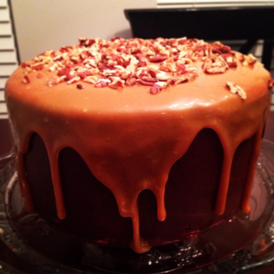 Vanilla Bean Cake with Salted Caramel filling, Covered with Chocolate Ganache and Caramel with Toasted Pecans